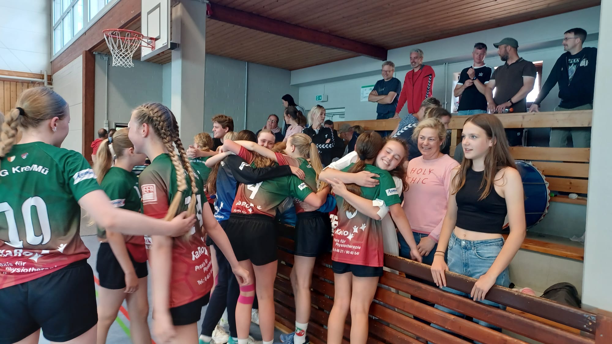 Am Sonntag ging es für unsere Mädels der wjC in die letzte Qualirunde! Vorweg möchte ich hier erstmal ein großes Dankeschön loswerden! An die Eltern dieser Mannschaft, nicht das sie nur fleißig beim Abbau der Jubiläumsfeier des MSVS geholfen haben .Sondern zusätzlich für einen unfassbar ,großartigen und umfangreichen Kaffeestand gesorgt haben.Da blieben keine Wünsche offen!“Dankeschön „. Des Weiteren geht ein Dank an die mjB und mjA für den Einsatz am Kampfgericht raus! Besonders erwähnen möchte ich allerdings die wjB,die selbst leider am Tag vorher den Einzug in die SH-Liga verpasst hat.Sie waren nicht nur der lauteste Fanclub, sondern übernahmen den Verkauf um die Eltern zu entlasten, halfen beim Abbau und feierten mit den Mädels der wjC !Ein wahnsinns Zusammhalt ,der fast für Pippi in den Augen sorgte!Danke Mädels, für diese Momente! Um 12:30 Uhr startete dann die erste Partie gegen Stockelsdorf. Unsere wjC war auf den Punkt wach,ihre Abwehrleistung ausdrucksstark und schön ballorientiert.Sie ließen die Gegnerinnen kaum zum Zug und wenn stand dort noch Jonna ,die mit starken Paraden glänzte.Nach einer Hammerleistung ,ging es mit 10:2 in die Halbzeit.Auch in der zweiten Hälfte ließen die Mädels sich nicht aus dem Konzept (im Gegensatz der Trainerin)bringen.Sie nutzten ihre Chancen und spielten schön zusammen. 18:6 Die zweite Partie ging gegen Tarp/Wanderrup .Auch hier ließen die Mädels nichts anbrennen. Mit viel Tempo konnten sich 8 Spielerinnen in der Torschützenliste eintragen und Pia zeigte uns starke Paraden .Die Mädels wuchsen zusehends zusammen und beendeten das Spiel mit 6:26! Die Freude war riesig ,schon fast zu Vorfreudig.Denn sicher war noch nichts…. Plötzlich wendete sich das Blatt und Stockelsdorf gewann im harten Derby überraschend gegen Bargteheide.So wurde erstmal wild gerechnet, was wäre wenn….. Doch die Ansage der Mädels und dem Trainerteam war ….dann gewinnen wir eben auch noch das dritte Spiel! Hui ,dann mal los.Um 18 Uhr startete dann die letztendlich entscheidende Partie.Der Tag war lang,ob die Mädels nochmal so ihre Leistung abrufen konnten… Die Partie gestaltete sich auf Augenhöhe.Eine torarme Halbzeit (6:5) zeigte die starke Abwehrarbeit auf beiden Seiten. Aber auch Jonna glänzte mit einer souveränen Körpersprache im Tor.Drei von vier gehaltenen 7.Metern! In der zweiten Hälfte legten unsere Mädels nochmal richtig ein drauf.Sie hatten Bock!Ein drei Tore in Folge Lauf, ließ die Gegnerinnen nervöser werden.Die Halle bebte und man konnte kaum sein eigenes Wort hören….Eine Wahnsinnsstimmung puschte unsere Mädchen noch zusätzlich und es gelang Bargteheide nicht mehr ran zu kommen. Der geglückte 7.Meter Wurf unserer langzeitverletzten Elin, lockte dem Einem oder Anderem die Tränen in die Augen. 14:9 Endstand, alle stürmten das Feld ….Es wurde gesungen,geweint und gefeiert! Was für ein Erlebnis! Die Mädels lieferten eine starke Leistung ab!Ob in der Abwehr oder vorn im Zusammenspiel! Herzlichen Glückwunsch und willkommen verdient in der SH-Liga.💚❤️ Allen Fans,Helfern,der mjC und der 1. Damen ,ein dickes Dankeschön für die volle Halle und die mega Stimmung ! Ein Dank auch an die Unparteiischen, so macht Handball Spass! Wir sind gespannt auf die Saison, diese Woche dürfen sich die Mädels erstmal ausruhen um gestärkt am Wochenende die Sichtung zu rocken!Viel Glück und Erfolg, wir sind jetzt schon stolz auf euch!